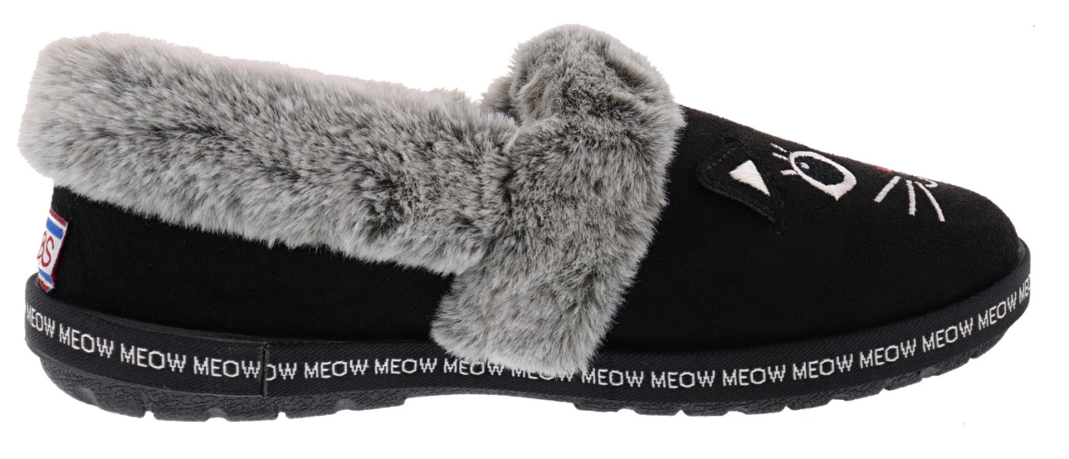 Skechers Bobs Too Cozy Meow Pajamas Memory Foam Slippers a slip on casual comfort slipper. Black bobs Skechers Cat 3D design. Bobs by Skechers cat shoes has a Memory Foam footbed. Indoor and outdoor use. Place your order today of women Bobs by Skechers.