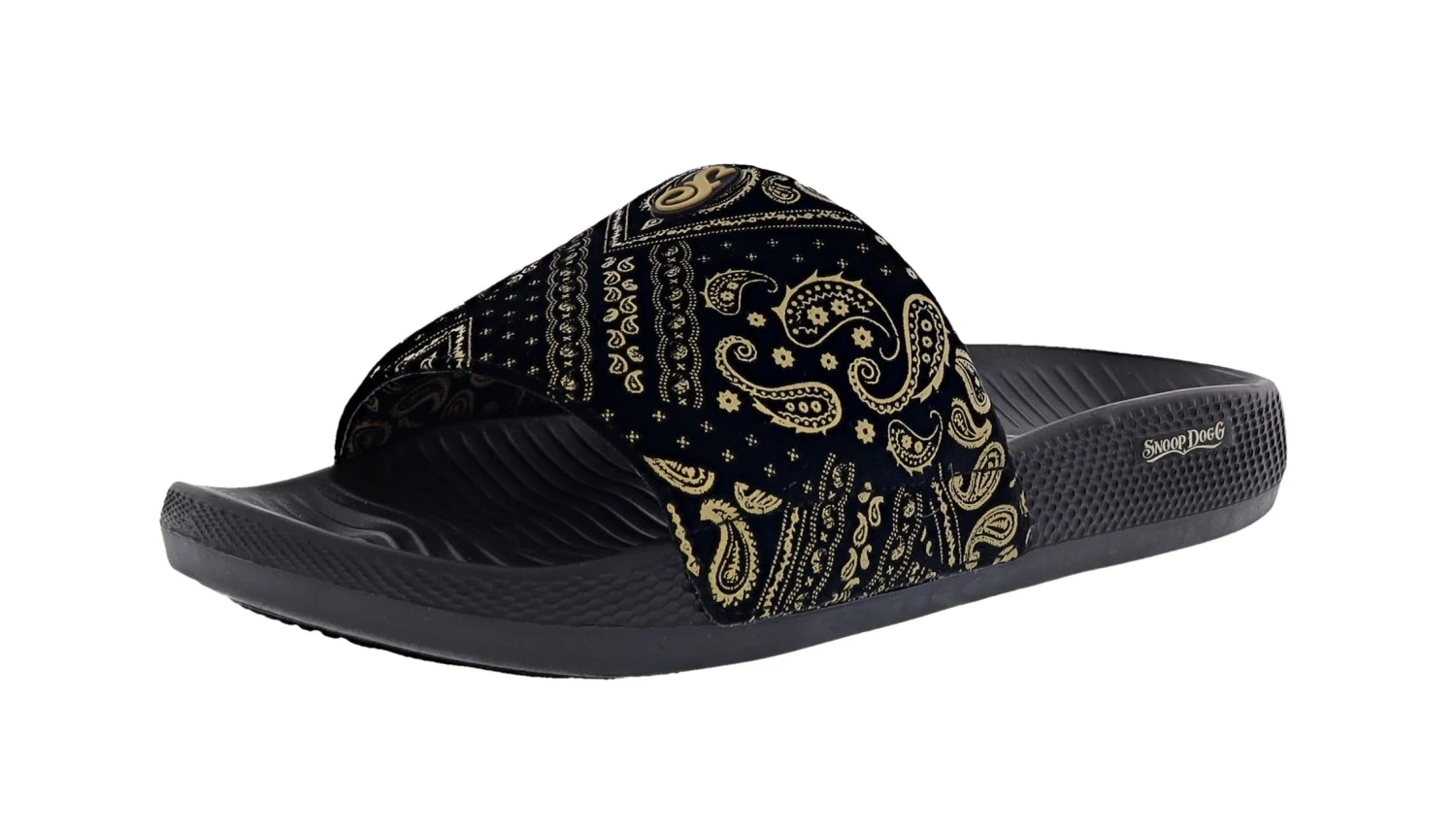 From the beach to the backyard: Skechers x Snoop Dogg: Low Slider – Velvet Paisley is the smoothest way to bring the heat to your slides-and-socks game this summer. This single crossband slide sandal features a velvet upper with an allover metallic paisley print, plus a contoured Luxe Foam footbed approved by the boss of laid-back style.